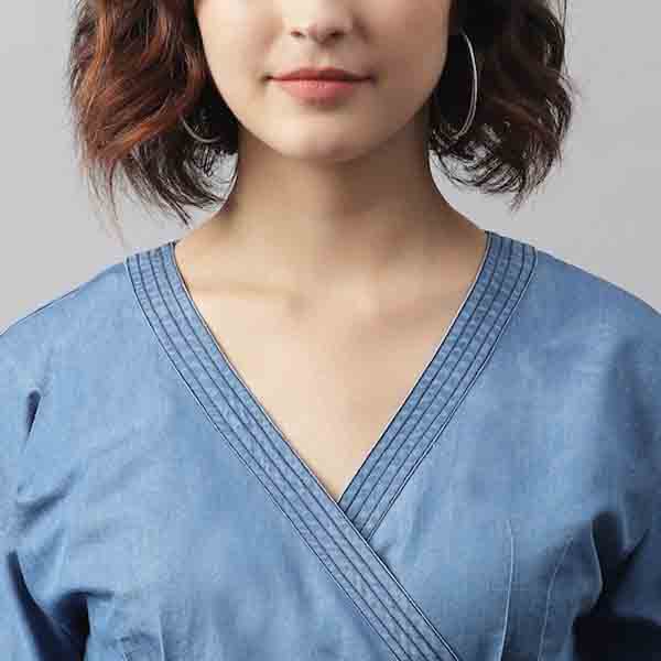 Blue solid culotte jumpsuit with waist tie-ups, has a v-neck, short sleeves, 2 pockets