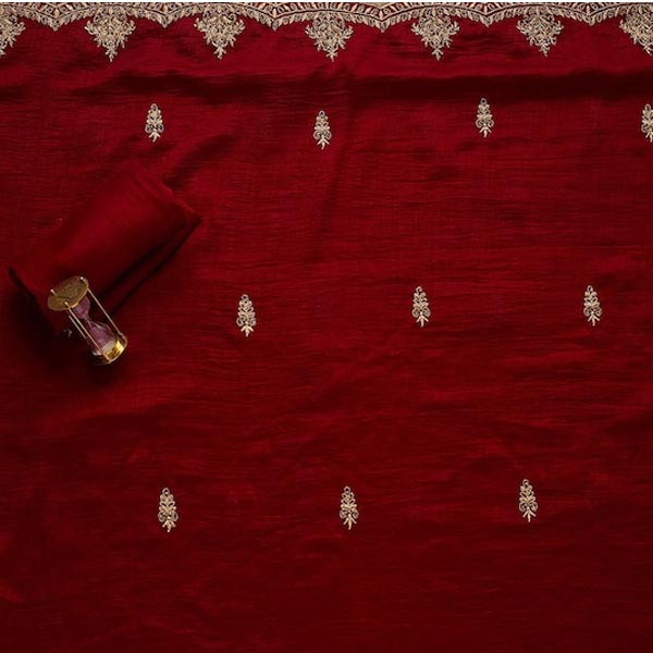 Maroon & Gold-Toned Embroidered Art Silk Unstitched Dress Material