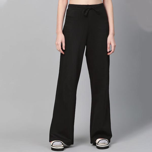 A pair of black solid wide leg track pants, has an elasticated waistband with outer drawstring closure
