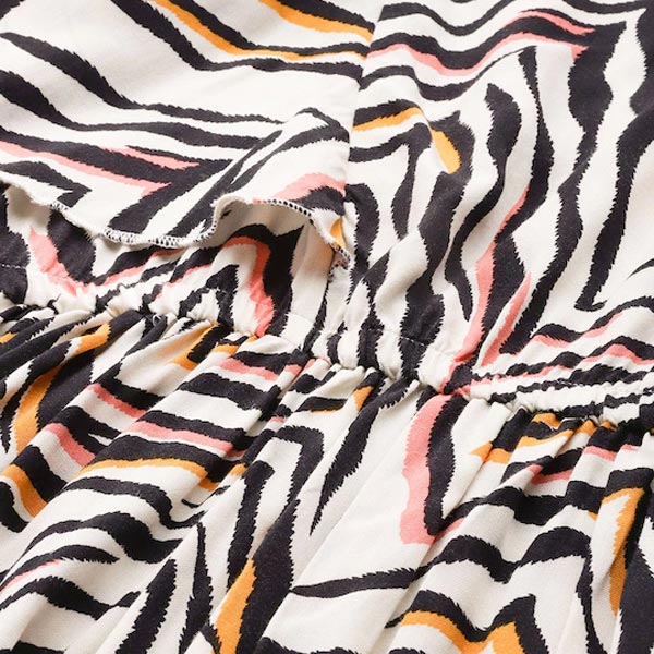 White and Black printed woven Maternity maxi dress with ruffles, has a V-neck, short sleeves, zip closure, and flared hem